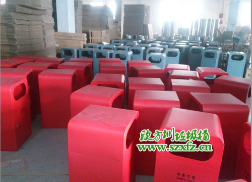 這批不銹鋼垃圾桶的規格是400*400*730mm,按照客戶的要求制作成三種顏色,并絲印不同的垃圾回收標識:45個藍色的印可回收垃圾的中英文字樣,47個灰色的印其他垃圾的中英文字樣,34個紅色的則印有害垃圾的中英文字樣。成品的造型十分精致漂亮,亮眼的顏色也是一道美麗的風景線。