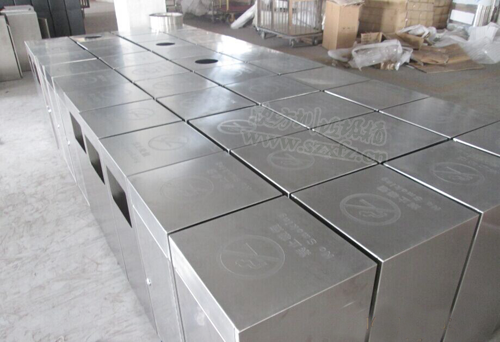 作為一家知名購物中心,采購不銹鋼垃圾桶要求極高。垃圾桶的選擇不容馬虎,兩者搭配得融入購物中心文化。我們欣方圳公司業務部人員,根據包頭茂業百貨來的圖樣,大規模的生產一款C60不銹鋼果皮箱。 本款采購的不銹鋼果皮箱規格為:350*350*720mm,顏色為砂光。采用201#不銹鋼厚度1.2mm,其中8個帶煙灰缸,42個不帶煙灰缸,內桶 為鍍鋅板。正面蝕刻茂業百貨字樣及標識。此款不銹鋼垃圾桶頂上開門,頂上蓋子固定活動。外部光滑明亮,簡單大方的方形設計,高貴不失風度。結合包頭茂業百 貨購物中心,讓更多的顧客有愉快的心情購物。