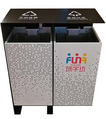 欣方圳商場不銹鋼烤漆景觀分類垃圾箱現場擺放圖