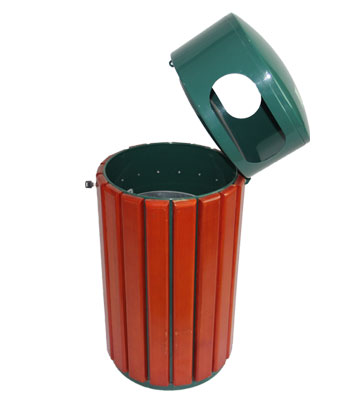 戶外圓形鋼木單桶垃圾桶產(chǎn)品多角度展示圖